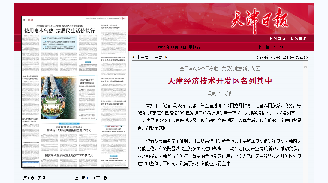 天津日?qǐng)?bào)】全國(guó)增設(shè)29個(gè)國(guó)家進(jìn)口貿(mào)易促進(jìn)創(chuàng)新示范區(qū) 天津經(jīng)濟(jì)技術(shù)開發(fā)區(qū)名列其中